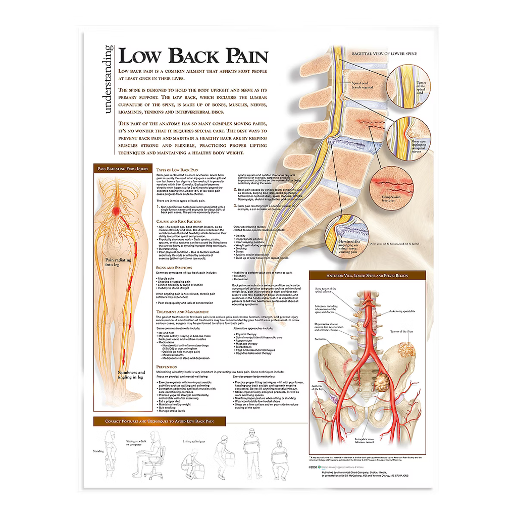 Lendryggssmerter er en plage som rammer de fleste minst én gang i livet. Ved å bruke de siste retningslinjene for korsryggsmerter fra American Pain Society (APS) og American College of Physicians (ACP) som referanse, forklarer denne visuelle og skriftlige oversikten over tilstanden: Typer korsryggsmerter Årsaker og risikofaktorer Tegn og symptomer Behandling og pleie Forebygging Denne plakaten illustrerer: En menneskelig figur (bakoversikt) med smerter som stråler nedover benet og svulst i ryggmargen, og nummenhet i spinnene e påvirkning forårsaket av osteofytter, kompresjonsfaktorer og ryggmargsnervepåvirkning forårsaket av diskusprolaps fremre visning av nedre ryggrad og bekken som viser svulster, infeksjoner, degenerative sykdommer, ankyloserende spondylitt, sakroiliitt, slitasjegikt og intrabekkenmasse for å unngå ryggsmerter.