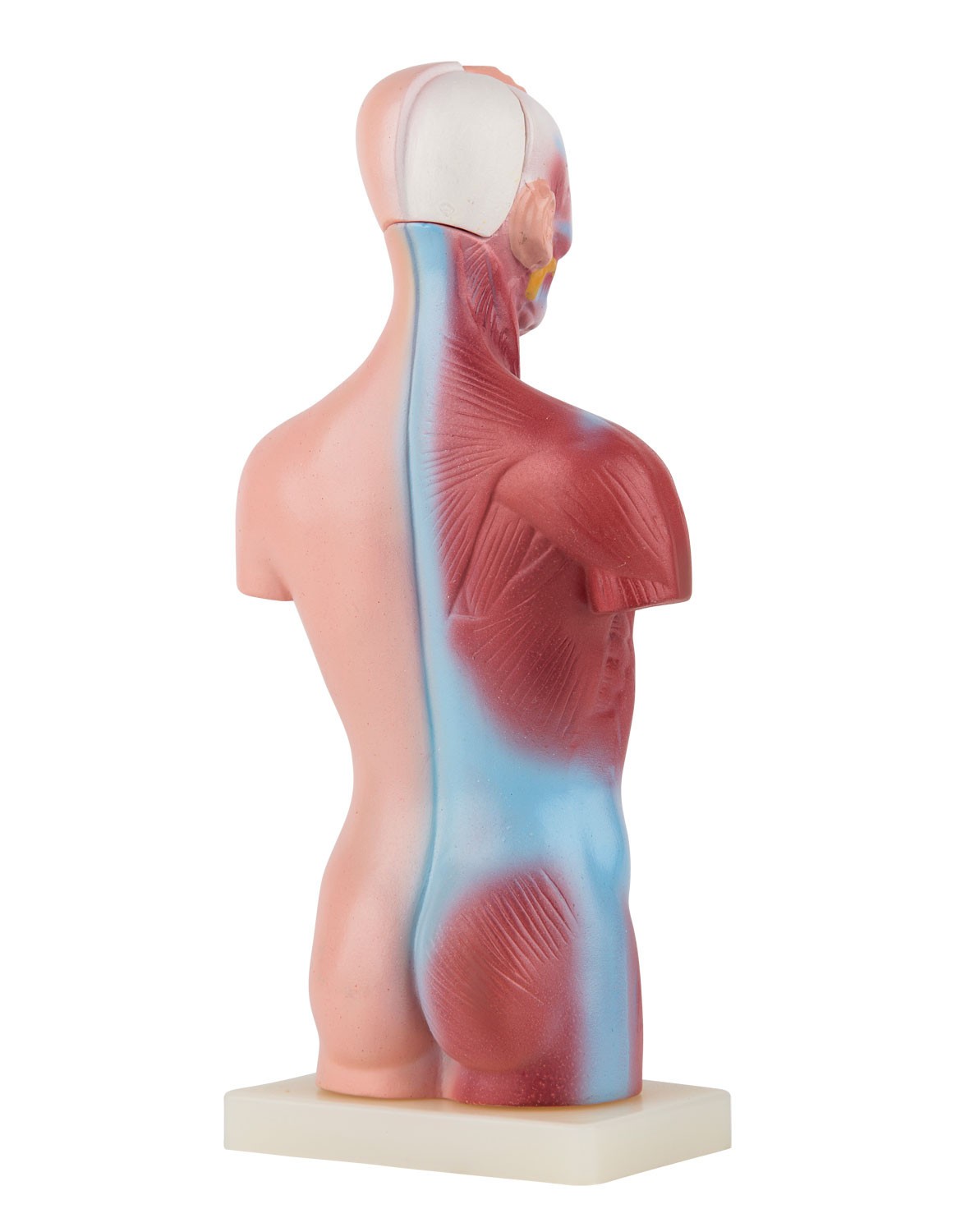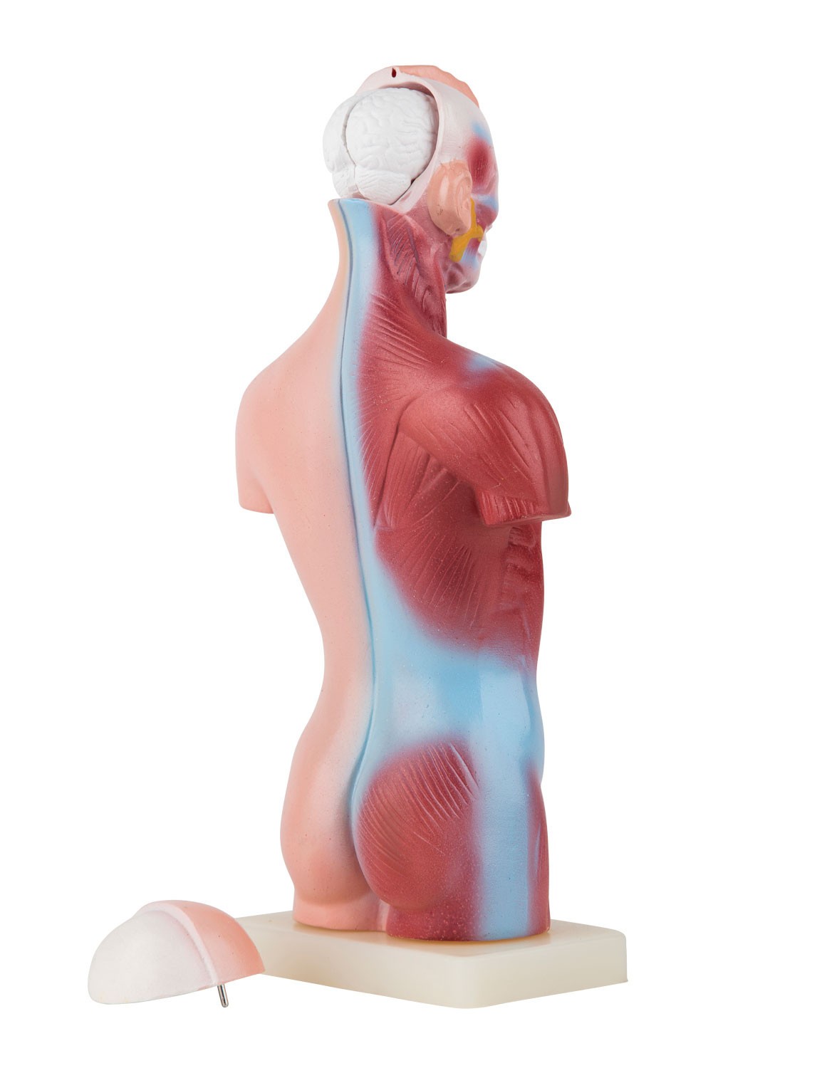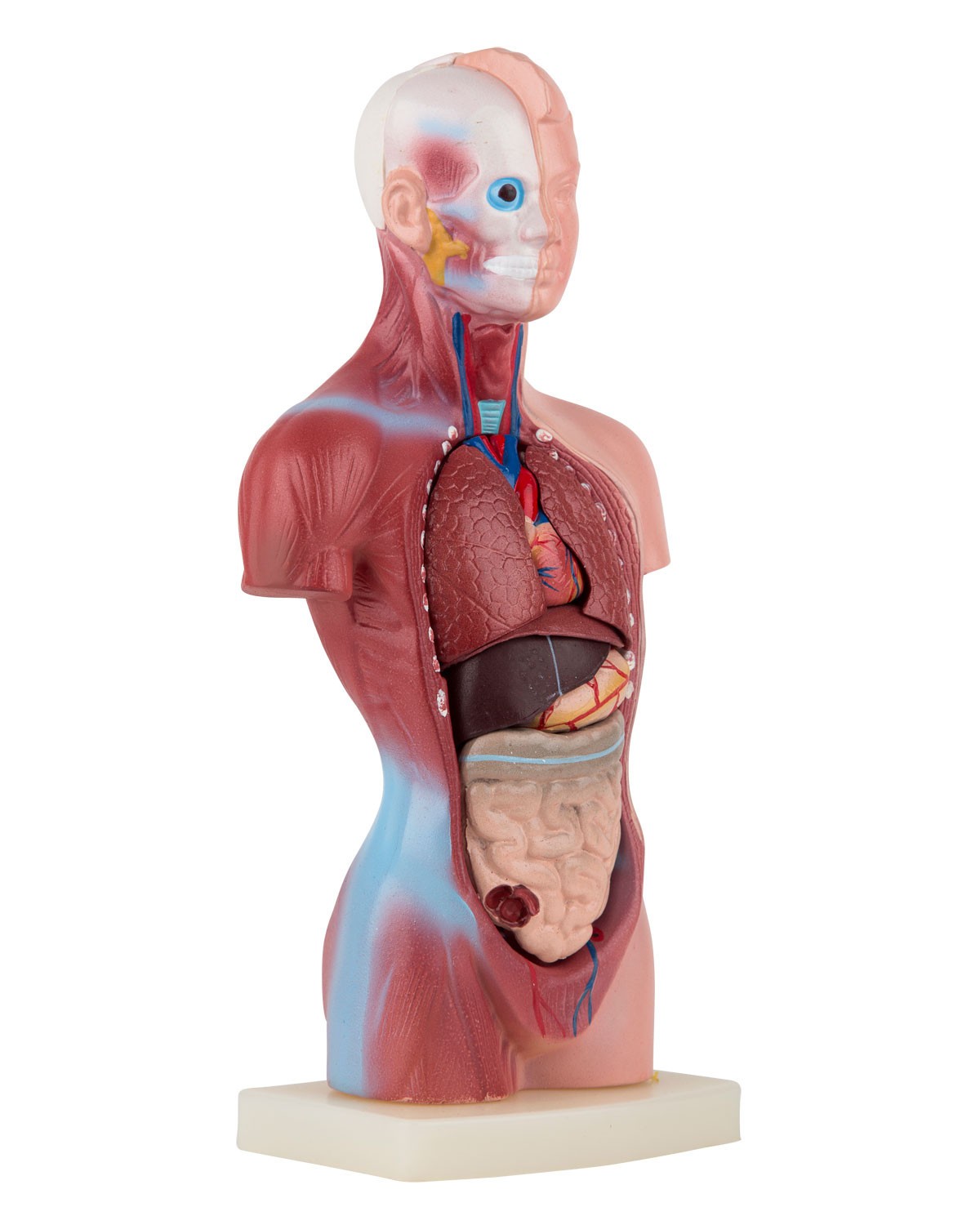 Denne lille og populære minioverkroppen er bare 26 cm høy. Til tross for størrelsen kan overkroppen deles i 15 deler. Overkroppen kan være en morsom gave eller tjene som et verktøy for å forklare de mest grunnleggende plasseringene og formene til menneskelige organer. Torson har følgende løse deler: - Avtakbar bakhode - 2-delt hjerne - 4-delte lunger - Hjerte - Spiserør, luftrør og aorta - Mellomgulv - Lever med galleblære - Mage - Duodenum og milt - Tarmsystem. I tillegg til muligheten til å ta ut de ovennevnte løse delene, demonstrerer overkroppen selv den overfladiske muskulaturen på høyre foran og bak, men med mindre detaljer. Både kjevemusklene og hele ryggen, inkludert: Skuldermuskulaturen er synlig. Vær oppmerksom på at de løse delene kan kreve litt tålmodighet å sette på plass igjen etter at de er fjernet.